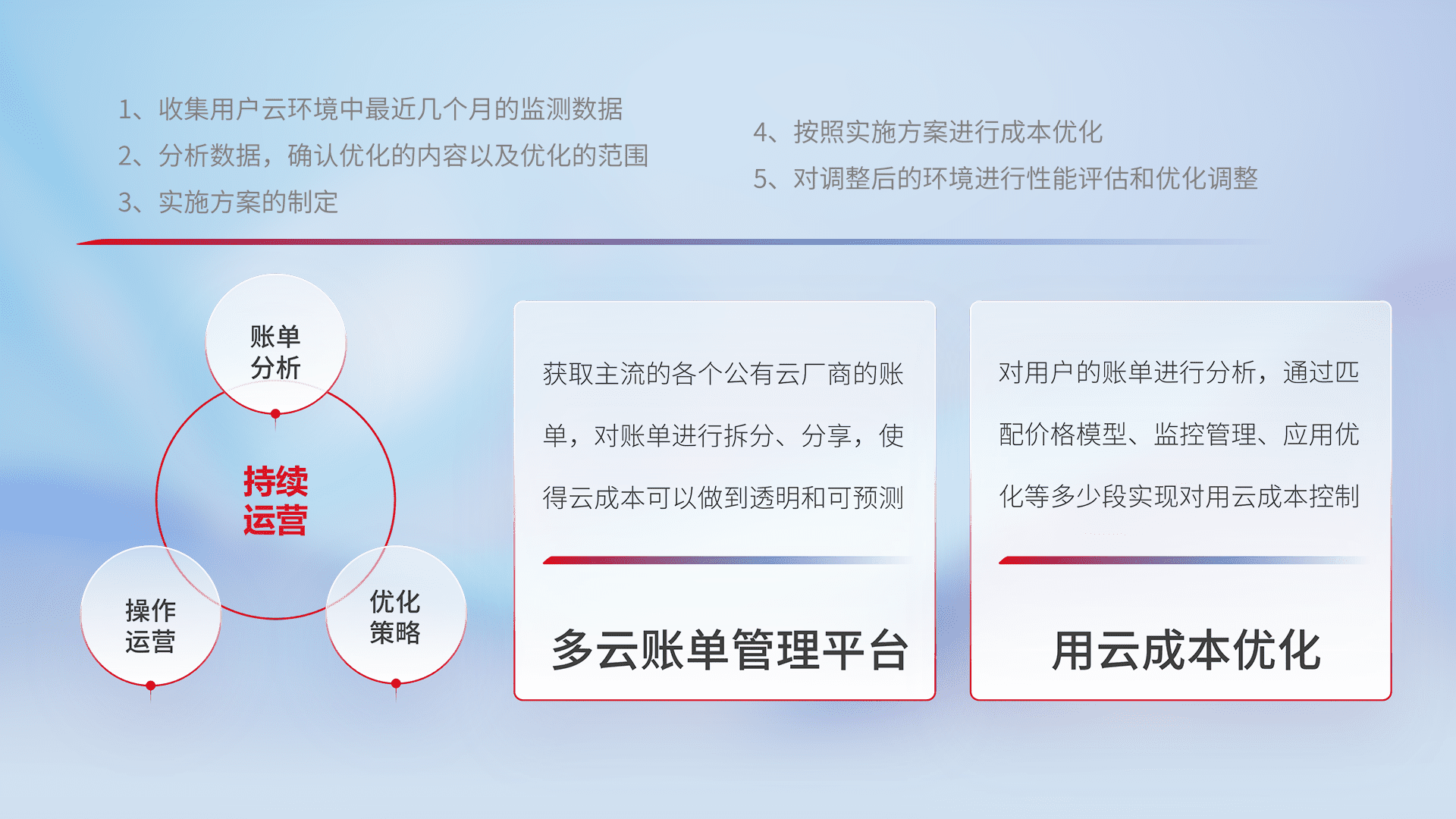 通过多云纳管,,,以统一的资源数据模型把客户的云资源进行抽象和封装,,进而实现对多云资源的统一操作,,,保障云资源管理的可靠性、、稳定性与可用性。。。。量身定制化运维内容,,配置、、开发运维、、、补丁管理、、、、备份、、、监控、、、认证和访问管理、、、审计和日常巡检等,,,,保障在用云过程中的可靠度,,,稳定度以及高可用率。。。。